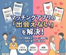 「足跡はつくのにいいねが来ない」「メッセージが返ってこない」。プロがプロフィールの「隙」を診断。警戒心を与えている表現や、情報不足を特定。誠実さと魅力を両立させた文章へとリニューアルし、停滞を打破したい時に最適です。