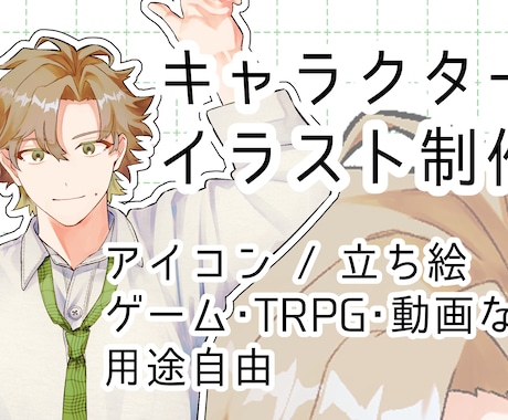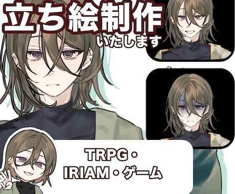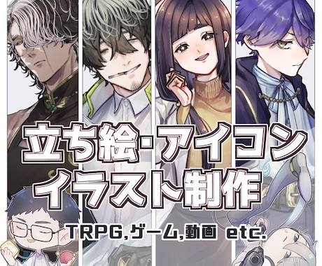自分の分身となるPC(プレイヤーキャラクター)やNPCの立ち絵、全身絵、表情差分、さらにはセッションを彩るシナリオ挿絵や背景、武器・衣装のデザインなど、TRPGに必要なビジュアル素材を一通り依頼可能です。ココナラでは、TRPGの世界観に精通した専門の絵師に直接相談・依頼が可能です。