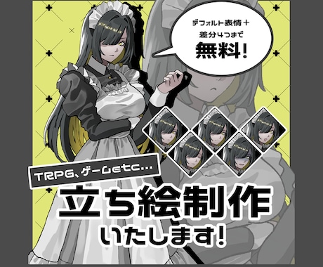 「狂気」「瀕死」「戦闘態勢」など、TRPG特有のシチュエーションに合わせた表情差分やポーズ差分を制作。セッション中のロールプレイがより一層盛り上がります。