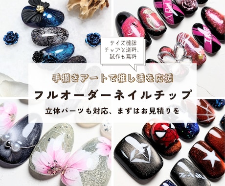 初めてのフルオーダーネイルチップでしたが、素敵な作品を作っていただき、お願いしてよかったと心から思いました! 初めてで私自身うまく伝えられない部分もあったと思いますが、イメージを丁寧に汲み取ってくださったり、キャラクターについてしっかりと調べて素敵な作品にしていただきました! また、対応も迅速尚且つ丁寧でとても安心してオーダーすることができました。 またぜひお願いしたいと思いました!