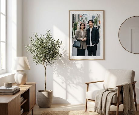 前撮りの写真を、まるで美術館のような質感のキャンバスパネルやアクリルパネルに。プロの手による色調補正とレイアウトを施し、日常の中に美しく想い出を溶け込ませる「飾る写真」としての活用法が人気です。