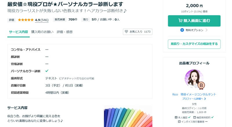サービス内容は、ココナラで1位のプロによる「メイク・ファッション診断」です。15700人以上を診断し、レビューで高評価を得ています。パーソナルカラー診断は、肌に調和する色を見つけるもので、服やコスメ選びに役立ちます。基本は春夏秋冬の4分類ですが、12分類の精密診断も可能です。オプションでセカンド診断や色見本も提供。診断はオンラインで、写真と問診が必要です。診断結果は慎重に行い、写真は診断後に破棄します。リーズナブルな価格で提供しています。