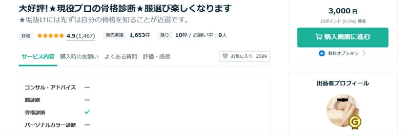 サービス内容は、ココナラでファッション診断数1位のプロによる精密な骨格診断です。TBS「がっちりマンデー」で紹介され、WEBメディアでの執筆経験もあります。診断はストレート、ウェーブ、ナチュラルの3タイプで、1万人以上を診断したプロが正確に行います。基本料金には骨格タイプとその理由が含まれ、オプションで着痩せのコツや季節のコーディネート例も提供。診断には全身写真と問診が必要で、迅速な対応を心がけています。