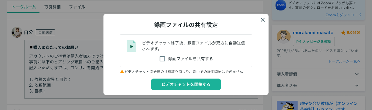 ココナラでは、外部でのやり取りを禁止しております。このため、必ずココナラのトークルームからビデオチャットを開始してください。