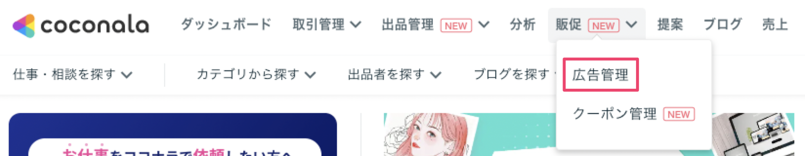 画面上部のヘッダーメニュー内「販促 > 広告管理」からご利用ください。