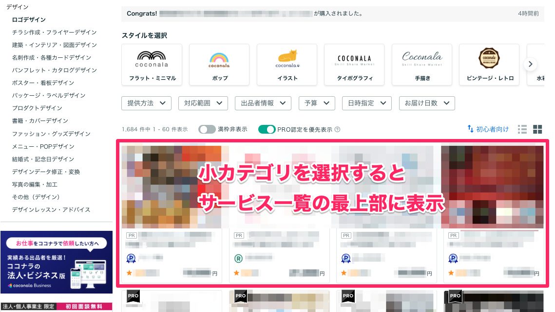 「出品したばかりのサービスをもっと見てほしい」「自分の顧客層に向けて表示させたい」という場合には、サービスに興味がありそうな購入者へ向けて広告枠に出品サービスを掲載できる「サービスPR」機能をオススメしています。